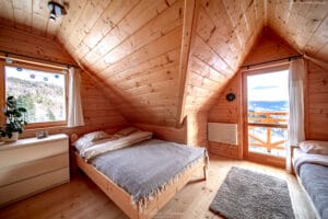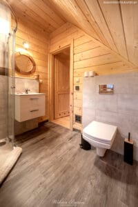Wnętrza domków zaprojektowano z myślą o maksymalnym komforcie gości. Do ich dyspozycji oddano przestronne sypialnie z wygodnymi łóżkami, w pełni wyposażone kuchnie, które umożliwiają swobodne przygotowanie posiłków, oraz przytulne salony z kominkami – idealne miejsca na chłodne wieczory. Dodatkowym atutem jest plac zabaw, który zapewnia najmłodszym rozrywkę i aktywny wypoczynek na świeżym powietrzu.