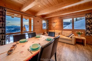 W domkach z bali na parterze znajdują się przytulne salony z kominkiem, połączone z jadalnią oraz w pełni wyposażoną kuchnią oraz łazienki. Z salonów prowadzą wyjścia na tarasy – z widokiem na Tatry